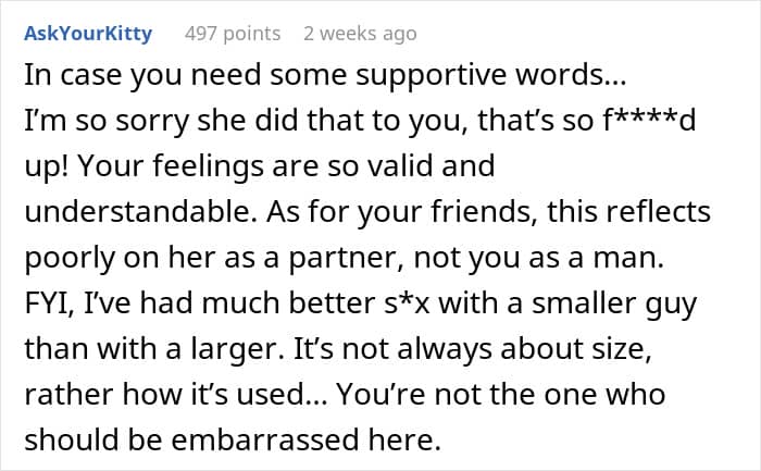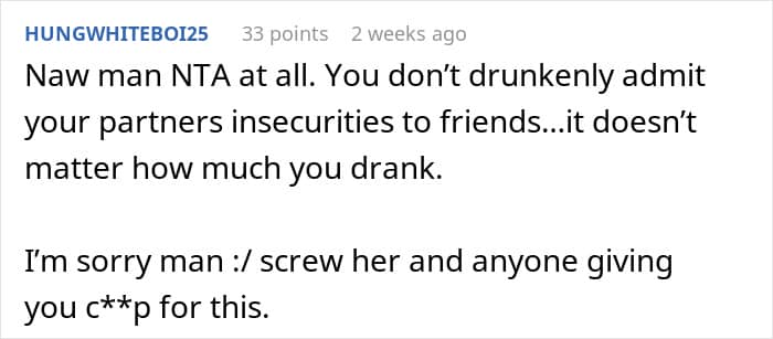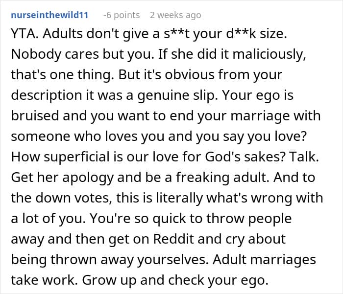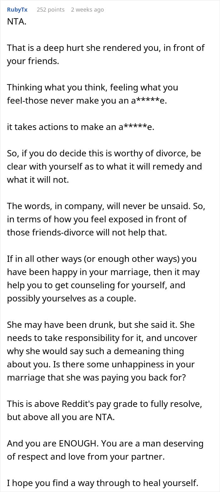For this man, the worst part was that his wife put his body insecurity on display for his friends. One night during a group dinner, she loudly joked about how “tiny” his private parts are. Feeling violated and humiliated beyond comparison, the husband even started considering divorce.