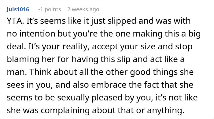 Dr. Bathurst has been working as an intimacy therapist for more than 15 years. She says that when one partner makes comments like the wife in this story did, it’s not about her dissatisfaction with her husband’s size per se.