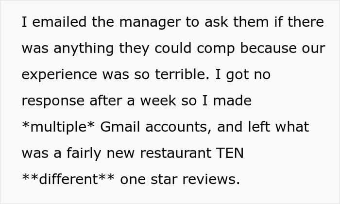 Not only that, but the restaurant refused to compensate the group in any way, so the woman decided to teach them a lesson by creating 10 different Gmail accounts, one for each person of the group, to leave a 1-star review.