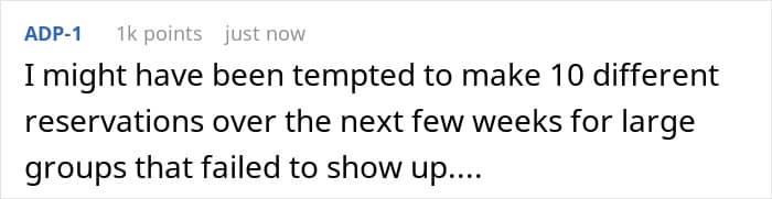 RELATED:Woman’s response to a restaurant accepting her reservation but not honoring it makes them regret not trying harder to accommodate her