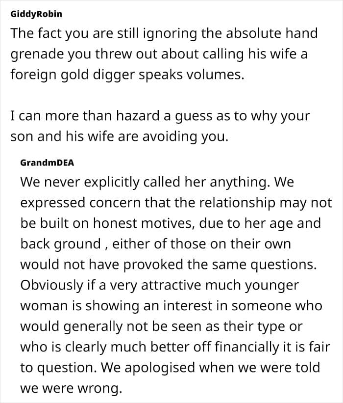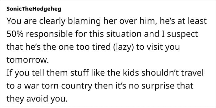 Whenever this grandma brings up her concerns to her son, whether it’s about missing the wedding or the whole grandkids being off to a war zone thing, she gets nothing but defensive responses. Honestly, I’d be pulling my hair out by now. But is she really being that unreasonable to want to be part of her grandkids’ lives?