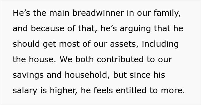 The thing is that the husband was the main breadwinner for the family and, although the author also had her own job, the main contribution to their savings and the house was, accordingly, his. Therefore, the guy claimed that he was filing for full custody over their kids and wanted to take the house as well.