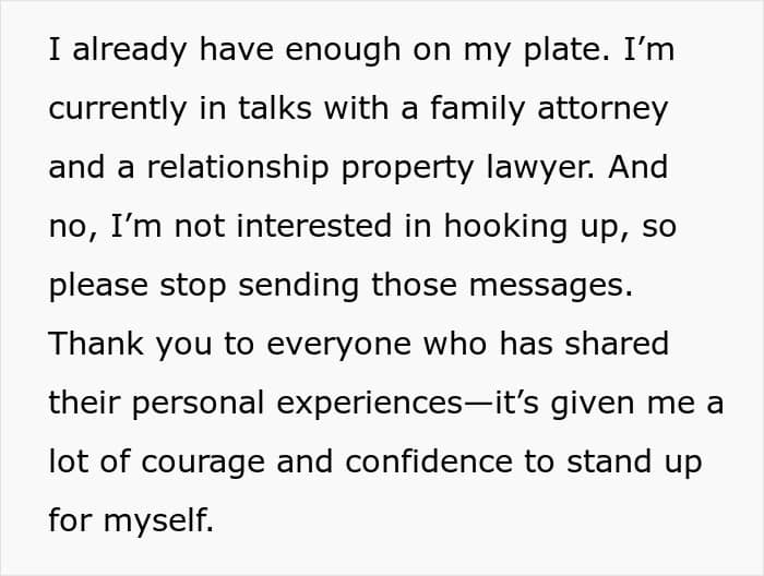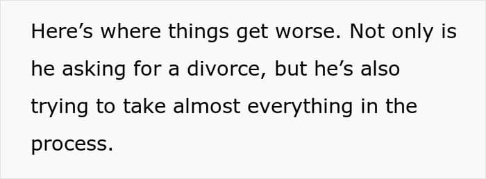 In any case, people in the comments to the original post sided with the author as much as possible, stating that divorce laws are actually designed to protect the more vulnerable partner. And in their marriage, she was clearly the more vulnerable one. “If you both live in the west that guy is gonna get a surprise when this gets to court,” one of the commenters reasonably wrote. “And he is also going to have to pay for your lawyer.”