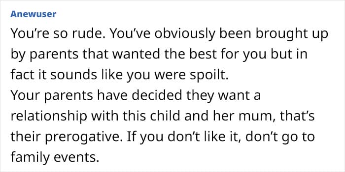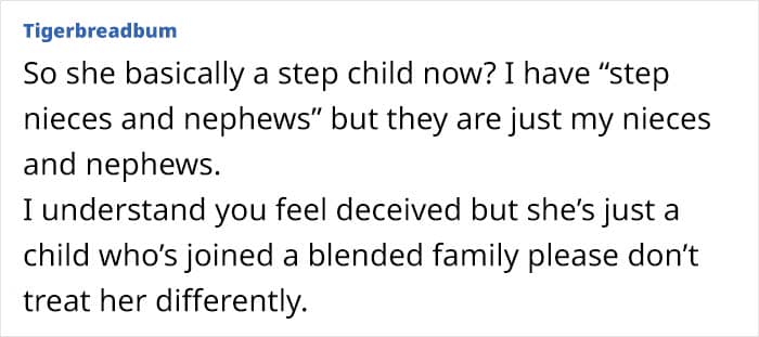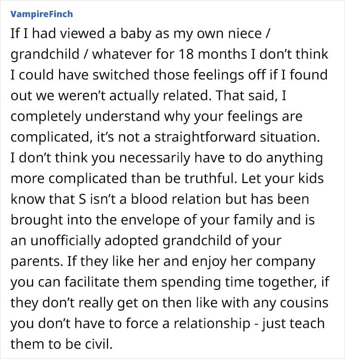 People felt the author should let go of the fact that there’s no blood tie since other family members have already embraced her as part of the family