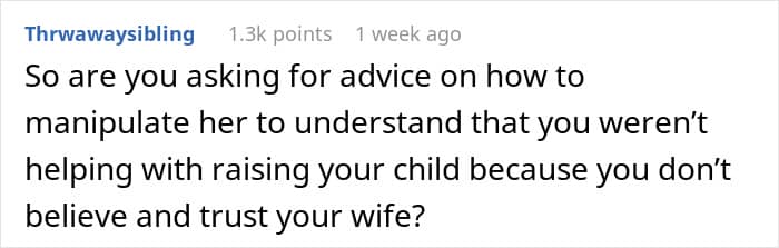 Many people in the comments are also almost sure that after what happened, there is no future for this relationship, and that all that remains for the OP here is to try to become a decent dad, at least. “You deserve this. Focus on being a better father and accept that it will likely be a coparenting relationship from now on,” someone wrote. And what do you, our dear readers, think here?