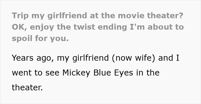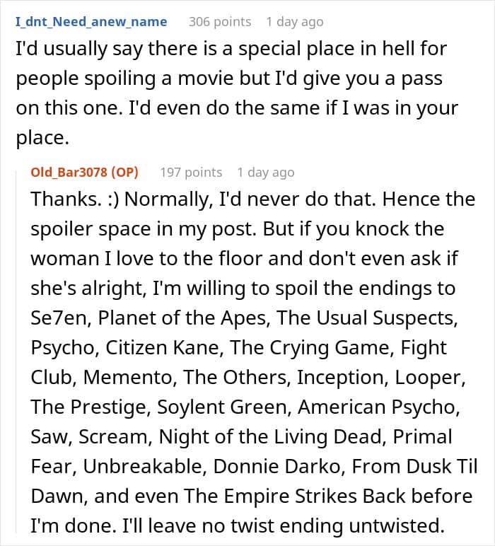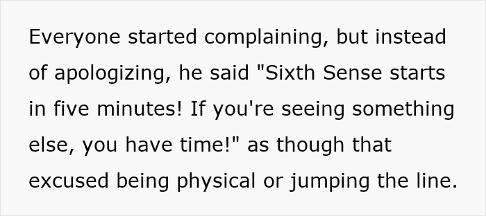 The OP (original poster) and his girlfriend (now wife) were simply trying to enjoy a night out at the movies when an entitled dude bulldozed his way through the ticket line, literally shoving people aside. His excuse? The Sixth Sense was about to start, so obviously, he had to get his ticket first. Never mind the fact that other people existed. In his mind, he was the main character.