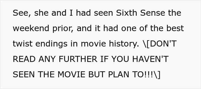 Our guy had already seen The Sixth Sense the week before. And if you’ve seen that movie, you know it has one of the biggest twist endings in cinematic history. With that in his arsenal, he walked right up to the line-cutting offender, called him out just enough to get his attention, and then, in the most nonchalant, devastating whisper, dropped the ultimate spoiler, ruining the entire movie for Mr. Rude.