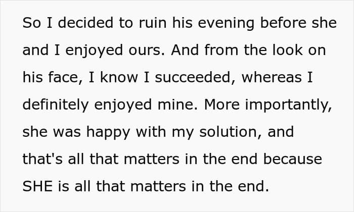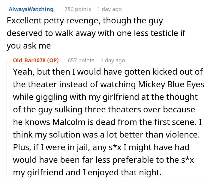 While Mr. Rude was stewing in his own entitlement, the OP went back to his girlfriend, who was safe and sound, and now in on the joke. They spent their own movie exchanging knowing glances while giggling to themselves. Poetic justice? Oh, absolutely.