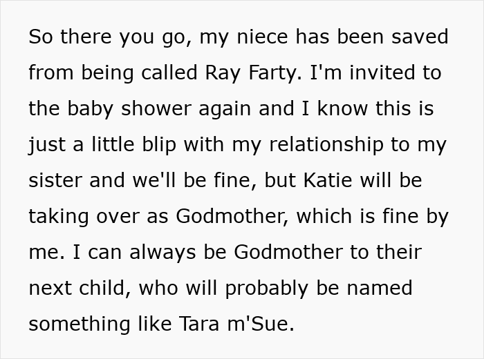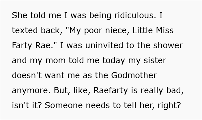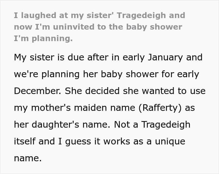 A woman shared how her honest critique of her sibling’s unique baby name choice led to her being uninvited from the baby shower and losing her role as godmother