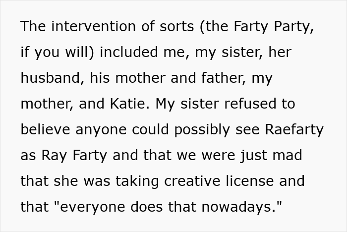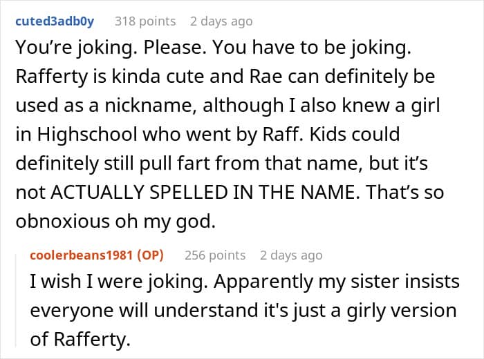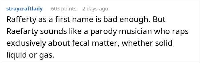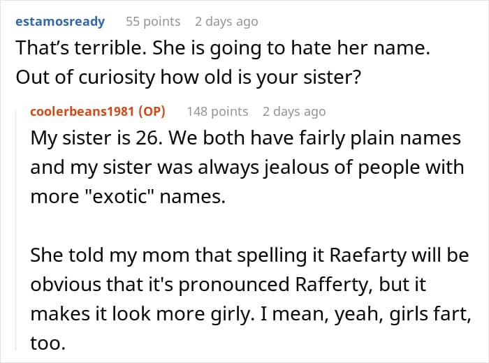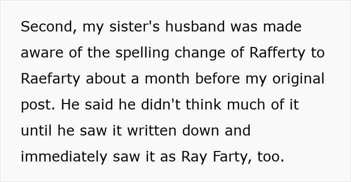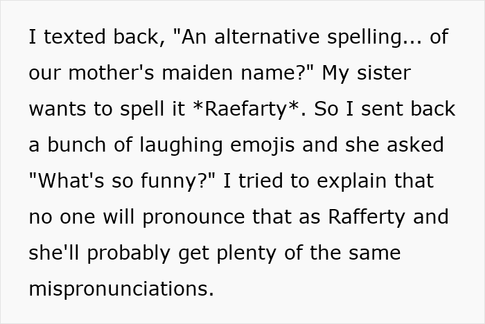 In this case, the author’s sister decided to creatively spell their mother’s maiden name, Rafferty, as Raefarty. While it’s understandable that parents want to add a unique flair to their child’s name, the alternative spelling might lead to pronunciation challenges or unintended associations—like the author humorously pointing out “Little Miss Farty Rae.”