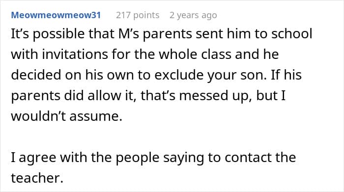 It’s pretty natural that no parent wants their child to be bullied, so folks online felt that the mother did the right thing by contacting the school.Many people also suggested that M’s parents might have given him invitations for everyone, and it might have been the kid himself who wanted to stir up trouble by not inviting the OP’s son.