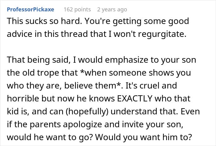 No wonder the kid came home crying to his mom about it!She also gives us a little info about M, who gets along fine with her son when they are alone, but in front of his other friends, he suddenly turns on his mean-boy mode. OP feels that since it’s M’s party, he can invite whoever he wants, but then, giving out the invitations in front of her kid and purposely excluding him seems cruel.