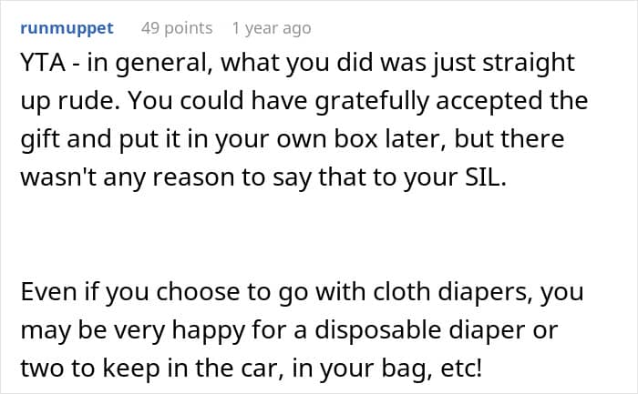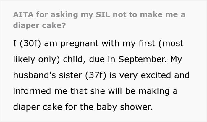 RELATED:The author of the post was pregnant with her first child when her sister-in-law informed her of her desire to gift a huge diaper cake for her upcoming baby shower