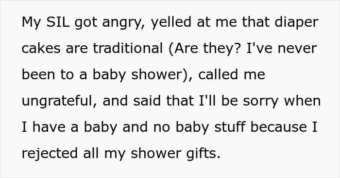 People in the comments agreed that diaper cakes are a big tradition yet the SIL’s behavior looks childish and totally inappropriate
