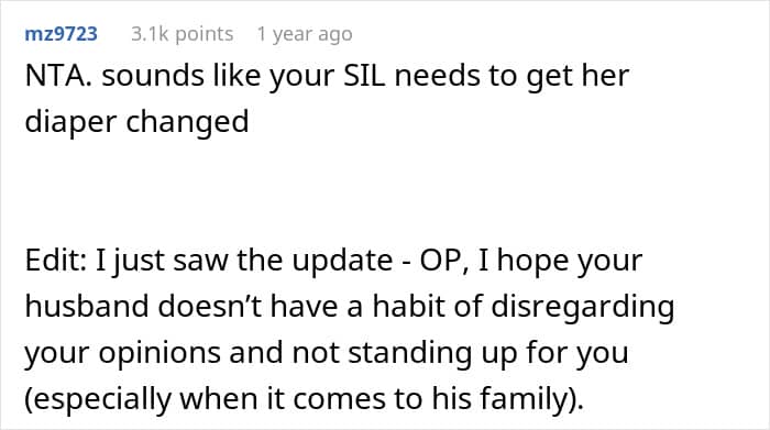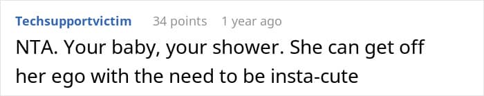 However, people in the comments could not help but note that from the side of the future aunt, this behavior looks completely childish, and that it is simply inappropriate to throw a tantrum over this. “Sounds like your SIL needs to get her diaper changed,” commenters sarcastically wrote. After all, this is the OP’s baby shower, so any aggression towards her looks like an overreaction, people in the comments think.
