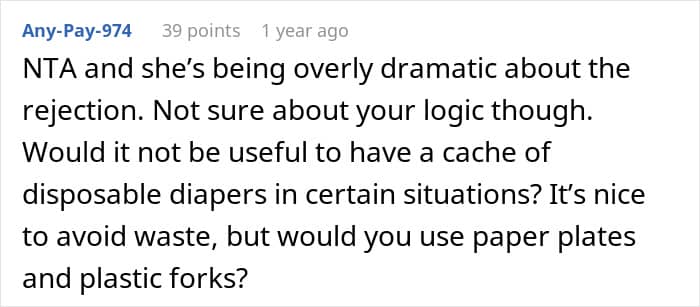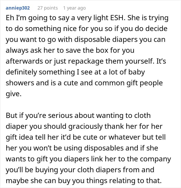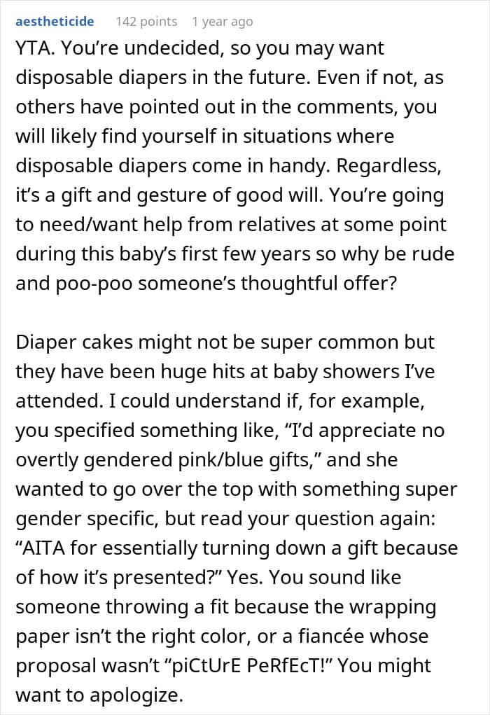 The original poster shared these thoughts with her sister-in-law, and said that she would probably refuse a gift in this form. But the woman was incredibly upset and even called the OP ‘ungrateful’, claiming that diaper cakes are more than traditional. A family drama followed, but then the husband and relatives nevertheless convinced the expecting mom that the diaper cake was cool, and that it was worth agreeing to this idea.