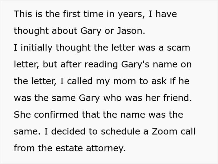 At first, the couple thought, of course, that this was some kind of scam, but after contacting the attorney, they found out that it was true. Moreover, the OP’s mom confirmed that this is the same Gary with whom she was friends many years ago. And whose son, “Jason,” is about the same age as the author, and they used to play video games together at their home as kids.
