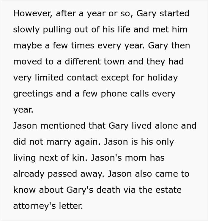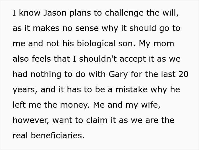 And yet, the mom advised the author to refuse the inheritance, assuring that Gary had no reason to mention him in the will. And Jason, as far as the OP knows, plans to contest the will. But for our hero and his wife, this would be a real life-changing moment, allowing them and their child to have a new standard of living.