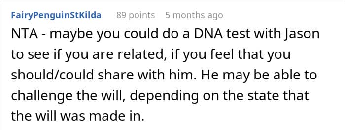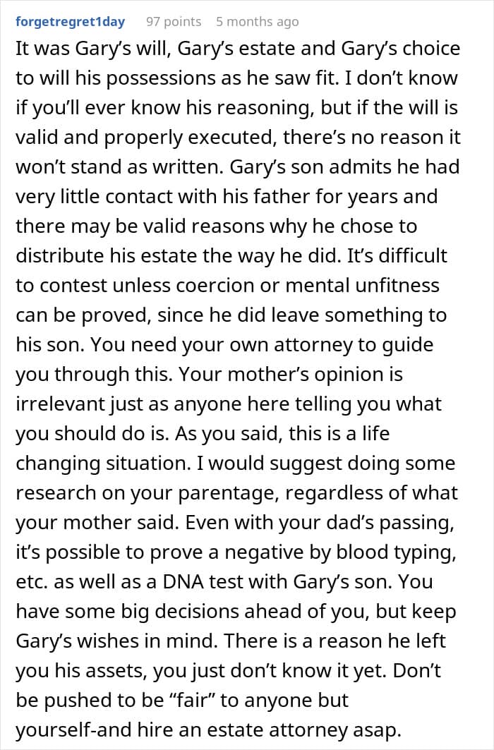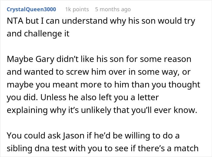Well, the commenters on the original post are almost sure that Gary was the author’s dad, and that it was not for nothing that he divided his fortune in such a way as to complicate Jason’s ability to challenge the will. “Something big happened between them and it was big enough for Gary to purposely leave you most of it and $100K to Jason to make it difficult to contest,” one of the commenters reasonably wrote.