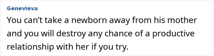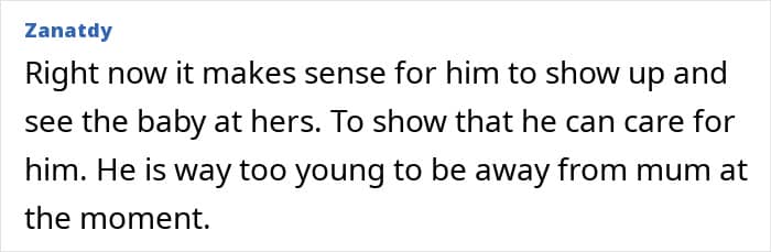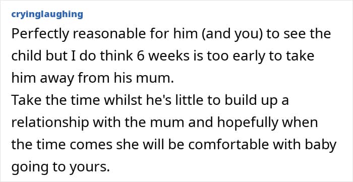 She turned to the internet to ask whether or not she was being unreasonable in wanting the baby to visit their home without his mom in the picture. Netizens had plenty to say, mostly how ridiculous it was to want to separate a 6-week-old baby from its mother for hours on end.