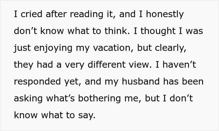 She also accused the OP of being selfish for not focusing on their needs, particularly as moms, and that she was “just partying” instead of acting her age. Naturally, the message left her in tears, completely unsure of how to respond. She had been under the impression that everyone was having a good time, only to be blindsided by resentment she hadn’t seen coming.