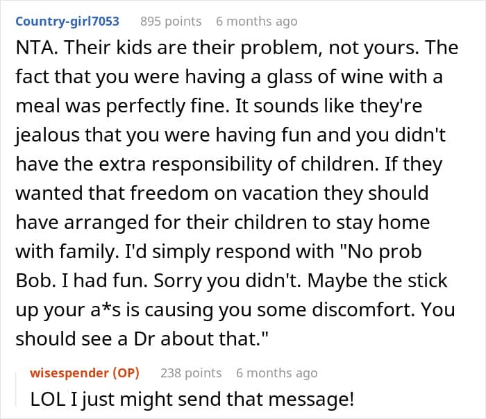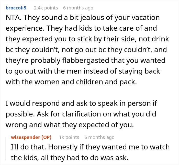 Netizens believe that the OP’s friends were acting out of jealousy rather than genuine hurt. They highlighted that her child-free lifestyle allowed her more freedom on vacation, which seemed to bother them, who were tied down with childcare. Others emphasized that traveling with friends who have kids often leads to different expectations, making trips like this a challenge.