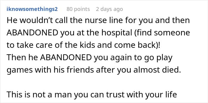 A woman asked the internet if she was wrong to be angry when her husband left her alone after a near-death experience so he could “hang out with the boys.” We got in touch with the wife in the story and she shared some more details and her thoughts on the entire ordeal.