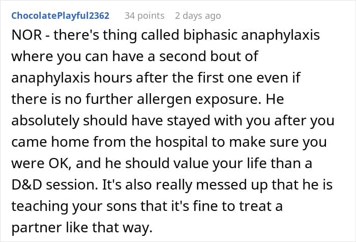 “After the post blew up I had a hard heart to heart with him. And we are trying to work through it. He didn’t understand how bad it was or how messed up it was to leave me alone after. We have agreed that if either of us end up in the ER, regardless of the reason, boys night is canceled. He’s been very attentive ever since, even cooking dinner the last couple of nights. And invited me to the next game night,” she added.