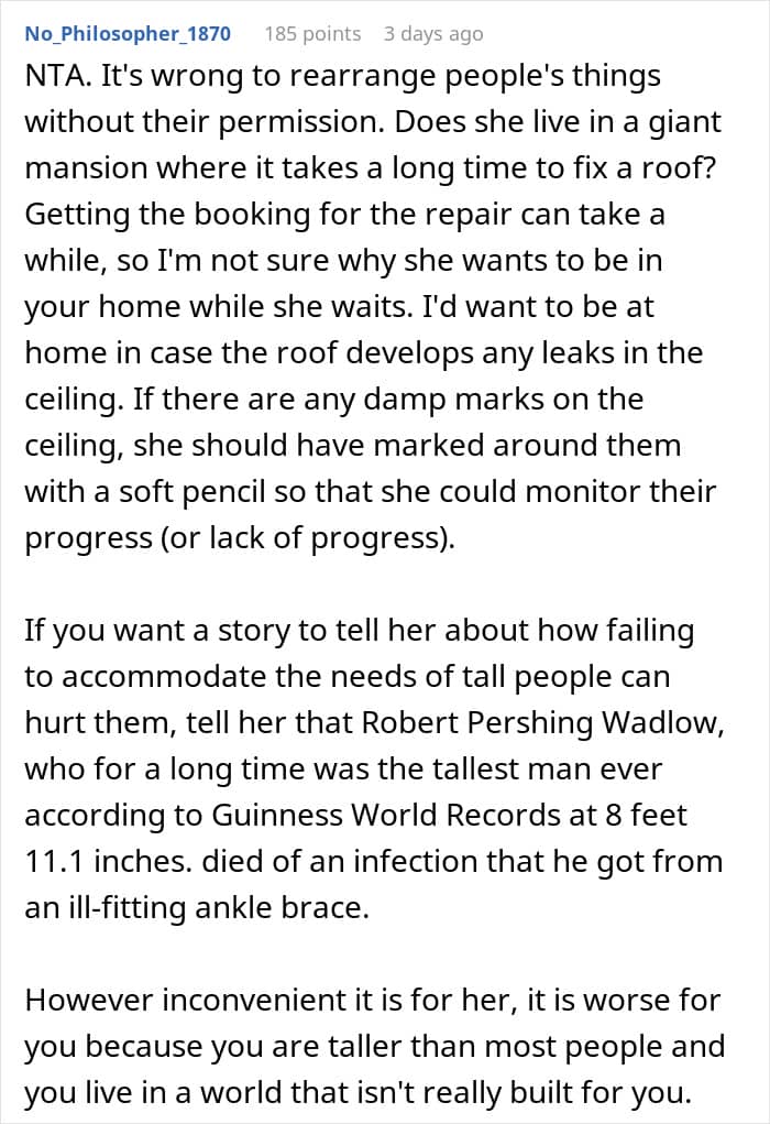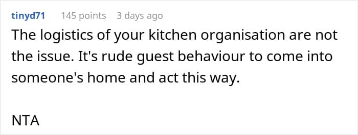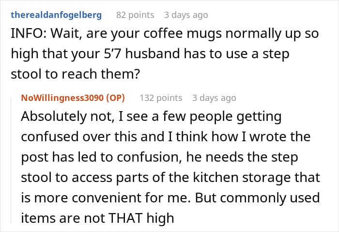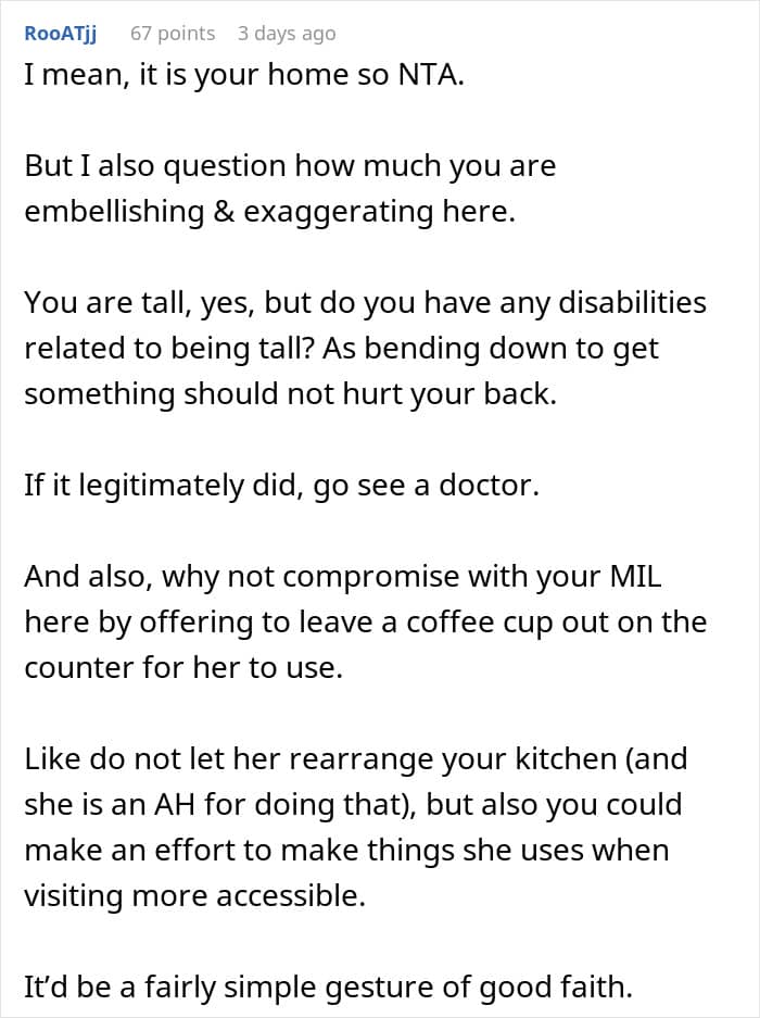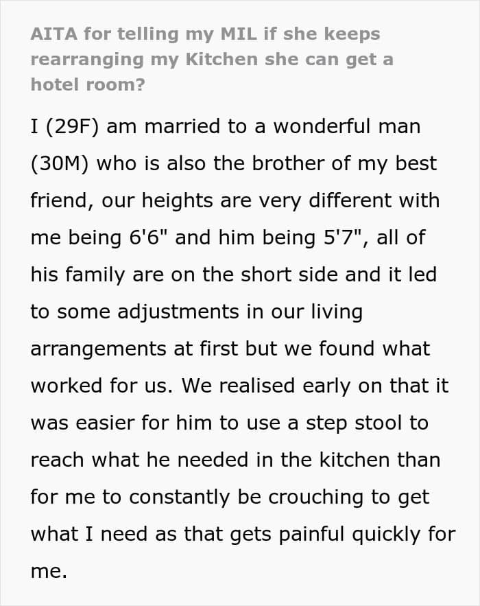 One woman recently shared how her 6’6” height has forced her to arrange her kitchen cupboards in a very particular way, so that she doesn’t have to crouch to get things. The woman’s (shorter) husband is happy to sometimes stand on a stepladder if needs be. But all hell broke loose when his mother came to stay, and kept rearranging the cupboards to suit her own needs. The woman retaliated in a way that’s now making her rethink her actions.