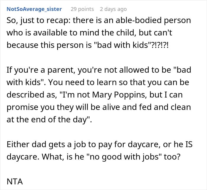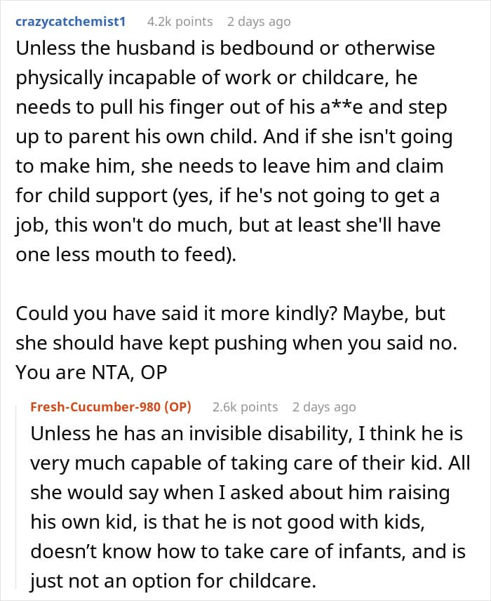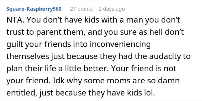 Ultimately, there are some arguments for the single mom to be more “diplomatic,” but the request from her friend was simply unreasonable. She, of all people, should know how hard and expensive it can be to have kids. This is why a “babysitter” is a job, not just something people do for fun. Hopefully, this can be a wake up call for her to get her family in line and her husband to do at least the bare minimum.