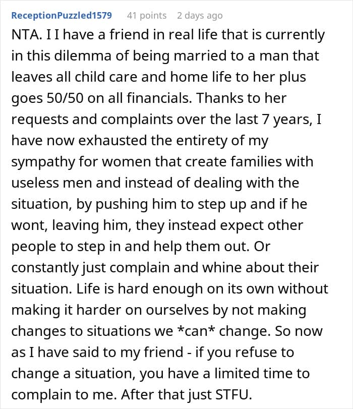 So even by the most traditional gender standards, he is useless, let alone from the much more modern idea that both partners need to carry their own weight. Unfortunately, this is a couple that is not willing to make the lifestyle changes they need to actually raise their children and, instead, are trying to leech off of a single mom. Unfortunately, particularly when there are income inequalities, some people see their friends as walking ATMs.