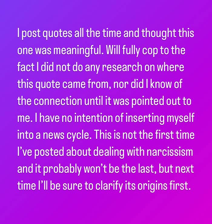 The actress wrote, “I post quotes all the time and thought this one was meaningful. Will fully cop to the fact I did not do any research on where this quote came from, nor did I know of the connection until it was pointed out to me.”