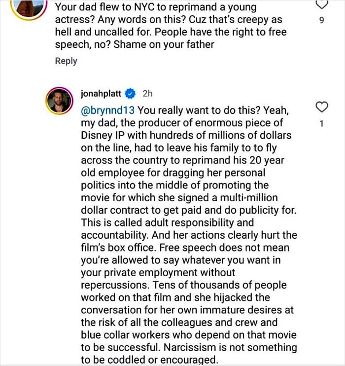 “My dad, the producer of (an) enormous piece of Disney IP with hundreds of millions of dollars on the line, had to leave his family to fly across the country to reprimand his 20-year-old employee for dragging her personal politics into the middle of promoting the movie for which she signed a multi-million dollar contract to got paid and do publicity for,” Platt wrote in the since-deleted comment, according to Variety.