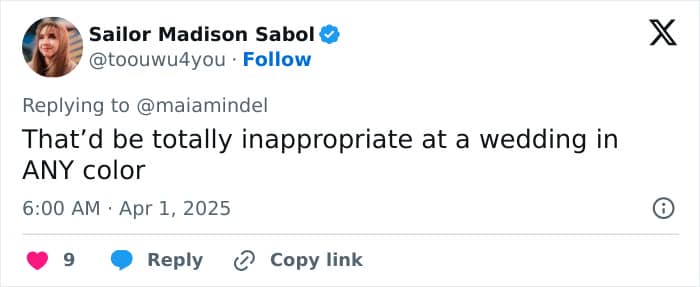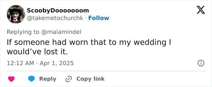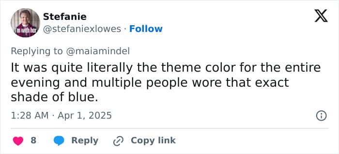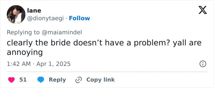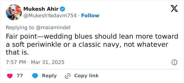 One user noted, “It’s literally the color the bride lick for the wedding party to wear even the men have the same color for their shirts,” and another added, “The bride chose the color of the dresses, please don’t speak from ignorance.”