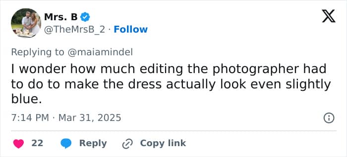 While one user simply said, “Any bride that is offended by a blue dress doesn’t deserve a wedding.”