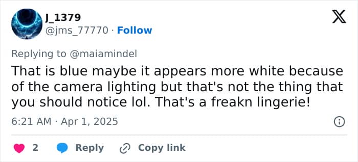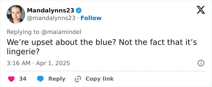 A third asked, “We’re upset about the blue? Not the fact that it’s lingerie?”
