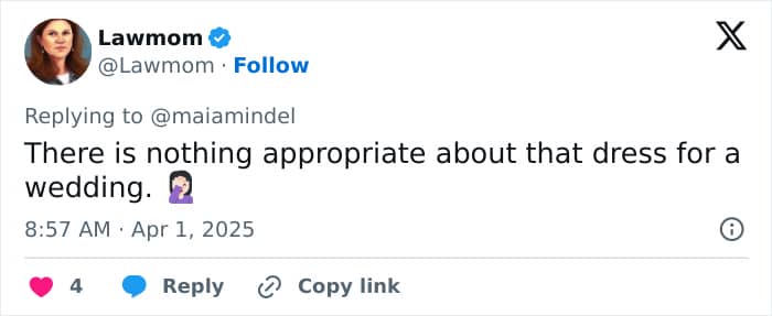 One user shared, “If someone had worn that to my wedding I would’ve lost it,” and another agreed, “I also think it’s kind of rude to have your b**bs hanging out at someone’s wedding.”