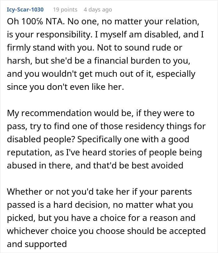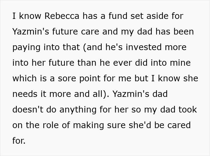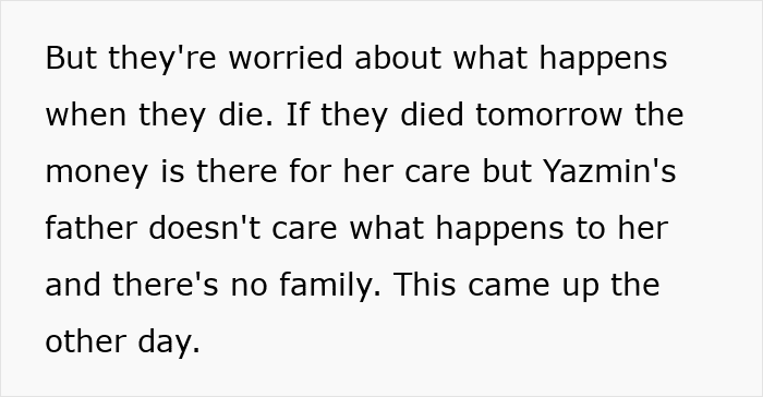 To be fair, they do have to deal with the very real issue of taking care of a heavily disabled child. Setting aside their demands towards the teenage son, this is a good and noble thing. Setting up a fund shows that they do take her wellbeing more seriously, although at the cost of perhaps creating a rift with him.