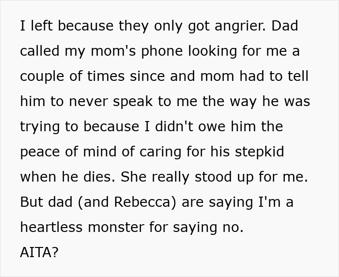 As many of the commenters note, the son is entirely in the right to decline if he isn’t willing. He is a child, this is a major life choice that he is being bullied into. Even worse, they choose to insult him over it, calling him a “heartless monster” even though it’s not his responsibility. This went from a salvageable situation into something a lot worse.