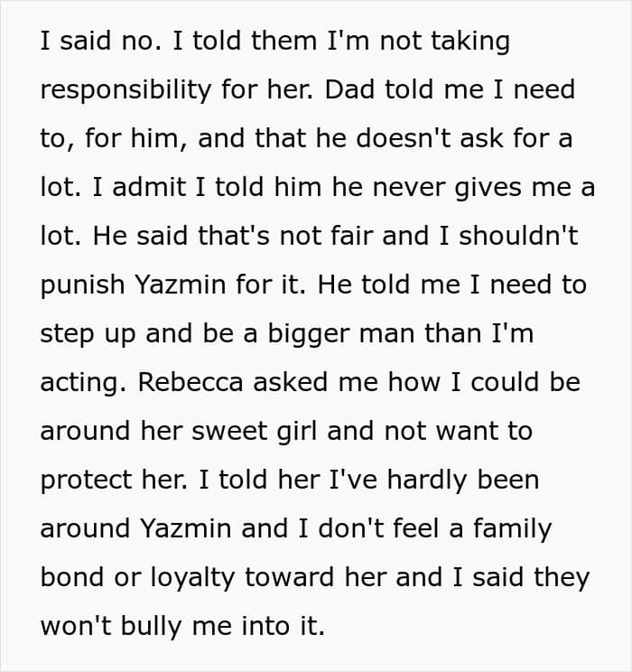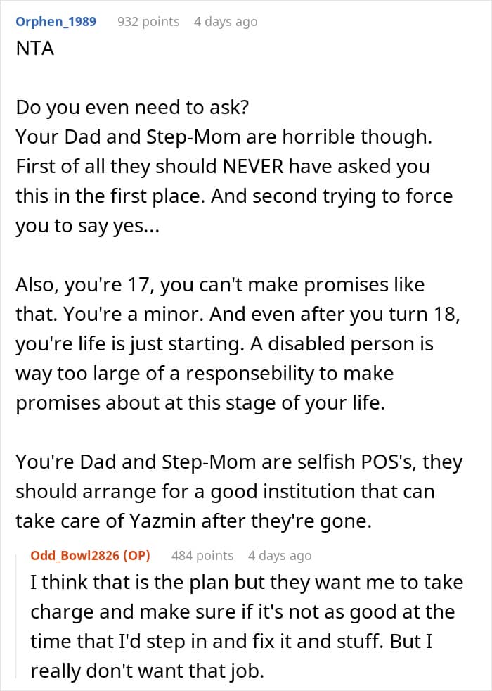 For example, this couple no doubt really did think that they had the childcare solution for their disabled daughter in the bag. They made the classic mistake of not actually informing their teenage son or discussing it with him, so his reaction is pretty normal. Instead of working out an agreement, they tried to push it on him.