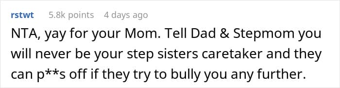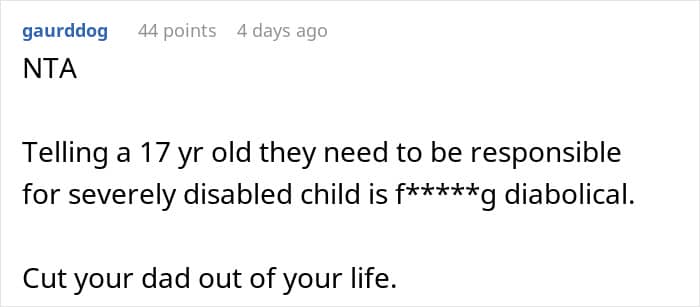 A teenage boy ended up in a significant argument with his father and step mother after he refused to become the caretaker for his disabled step daughter. We reached out to the young man who posted the story via private message and we’ll update the article when he gets back to us.