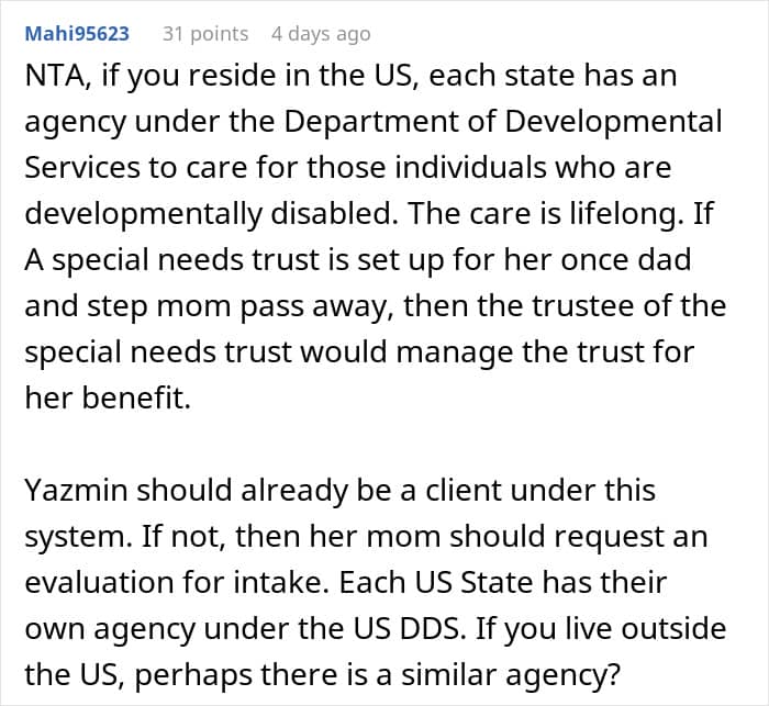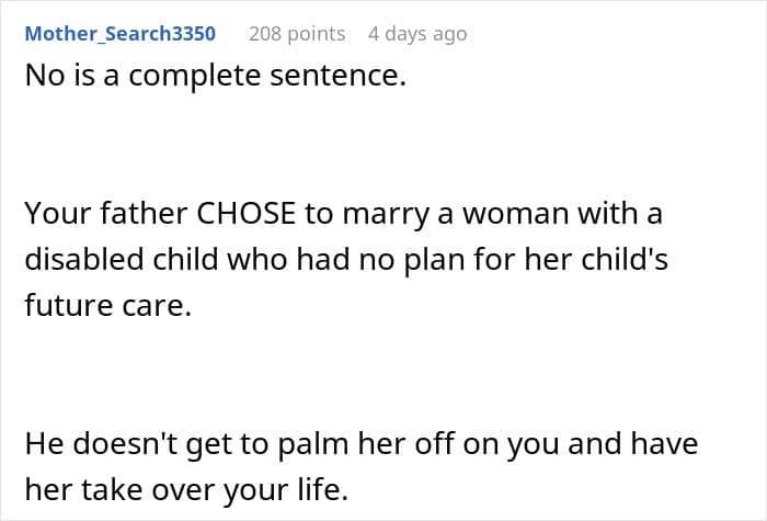 Fortunately, the son’s mom has his back and there are a lot of netizens sharing some support, which is important. When all you have is one group pursuing you, it’s easy to lose focus on what you want and believe and just follow the group. Ultimately, his father and step mother can’t make him become the caretaker of a disabled person without his agreement.