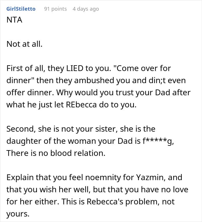However, it does seem like the father may have not been entirely honest to the teen’s step mom about his motivations. After all, as his father, he would know him better, most step-parents do understand that they don’t always have the best relationship. It’s, unfortunately, not hard to imagine her asking him about this idea and him just saying that his son would be ok with it. He then doesn’t bring it up or discuss it and now family drama is the result.