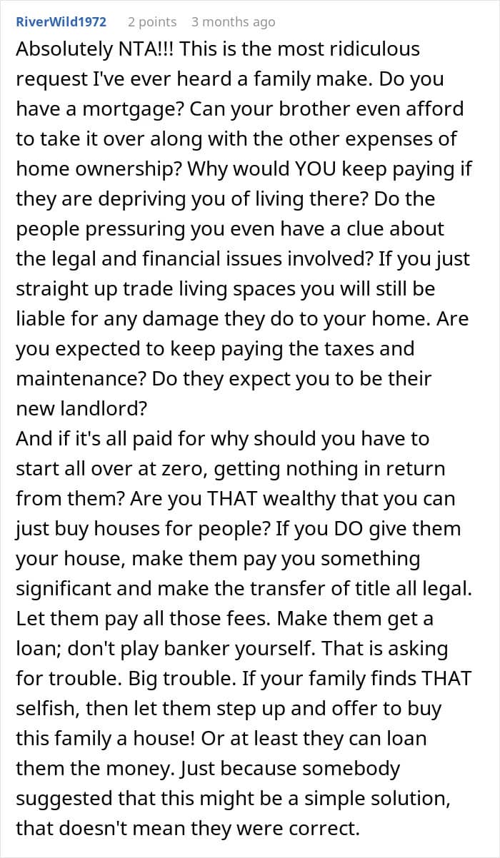 Entitlement is sadly common enough that most people have encountered a truly delusional person at least once, but it’s rare to see it in an entire family unit. Because the brother’s demand is truly unhinged, as OP is in no way, shape, or form required to just let a whole family take over his hard-earned house because it’s more comfortable for them.