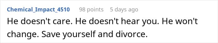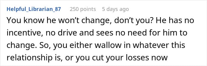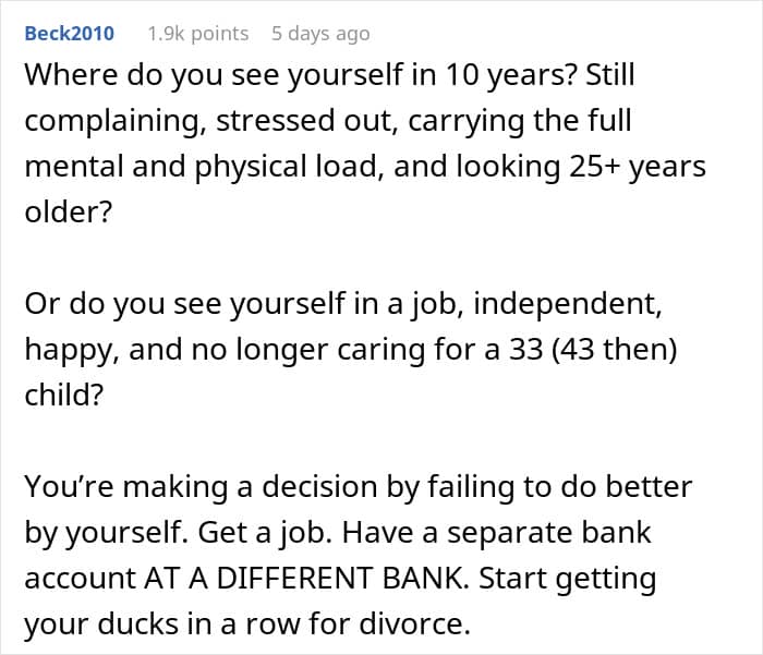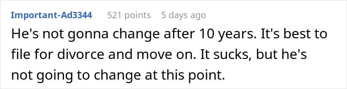 People in the comments urge the wife to get a divorce saying her husband will never change and she will be stuck in the same situation for another 10 years