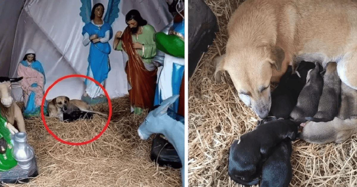 Stray dog takes refuge in a Christmas nativity scene to give birth to seven beautiful puppies