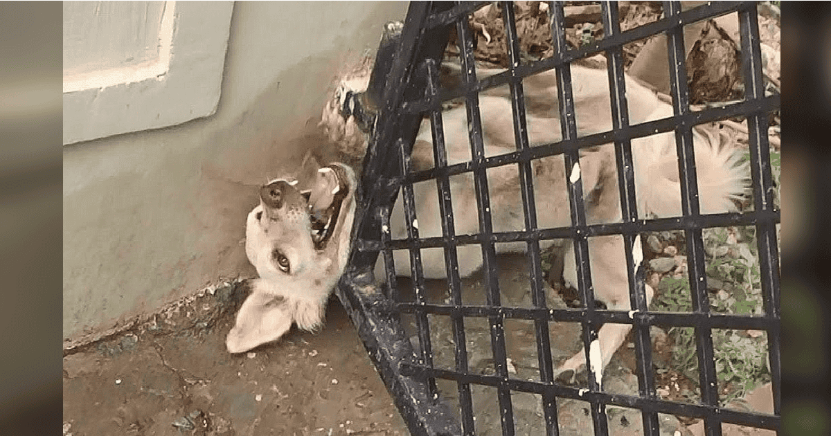 The dog was stuck in the iron door, groaning and crying for help for hours